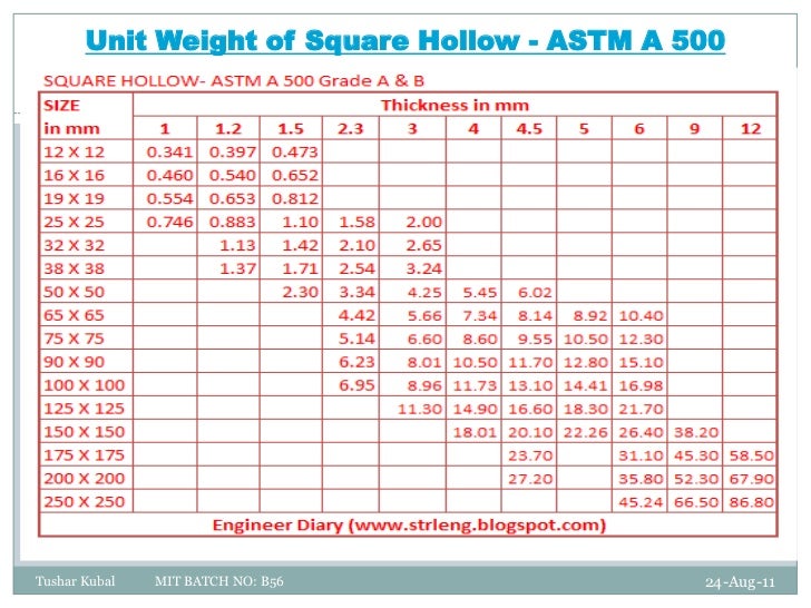 | tw metals javascript seems to be disabled in your browser. Din deutsches institut für normung e. Dimensions and weights of pipes astm a53/a53m. S 100 mm size (mm) section weight (kg/mtr) wt.per pc (6mtr) no.of pcs per mt 35 x 35 x 5 2.60 15.60 64 35 x 35 x 6 3.00 18.00 56 38 x 38 x 3 1.71 10.26 97 40 x 40 x 5 3.00 18.00 56 40 x 40 x 6 3.50 21.00 48. Surface area per unit length. L property table shape weight per foot depth width thickness area sx sy l5x5x7/16 14.4 5 5 0.4375 4.22 2.78 2.78 l5x5x3/8 12.4 5 5 0.375 3.65 2.41 2.41 Length in meter / ton. The book comprises totally 33 chapters there are, rolled steel equal angles, rolled steel unequal angles rolled steel tee bars, rolled steel beams rolled steel channels, properties of two equal angles back to back, properties of. 6 8 10 12 16 20 22 25 28 32 36 40 50 0.222 0.395 0.617 0.888 1.578 2.466 2.980 3.854 4.830 6.313 7.990 9.864 15.410 4510 2532 1621 1125 633 405 336 260 207 159 125 101 65 1) torsteel or twisted bar iss 1786 2) tistrong bar or grip bar iss 1139 steel india • www.steelindia.com • kirit vadalia : Steel (hot and cold rolled) galvanized steel: 1 ft2 = 0.0929 m2 1 lb = 0.4536 kg Zinc (inches) gauge decimal (inches) weight (lb/ft 2) gauge decimal (inches) weight (lb/ft 2) gauge decimal (inches) weight (lb/ft 2) gauge decimal (inches) weight (lb/ft 2) gauge decimal (inches) weight (oz/ft 2) gauge decimal (mm) weight (lb/ft 2) 44: Distance determining bolt hole location relative to the section.